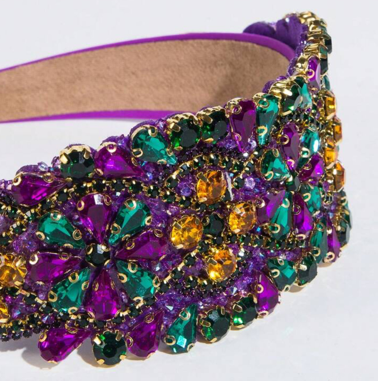Gorgeous wide-brimmed retro headband in vibrant Mardi Gras colors, sparkling with rhinestones and detailed beading.